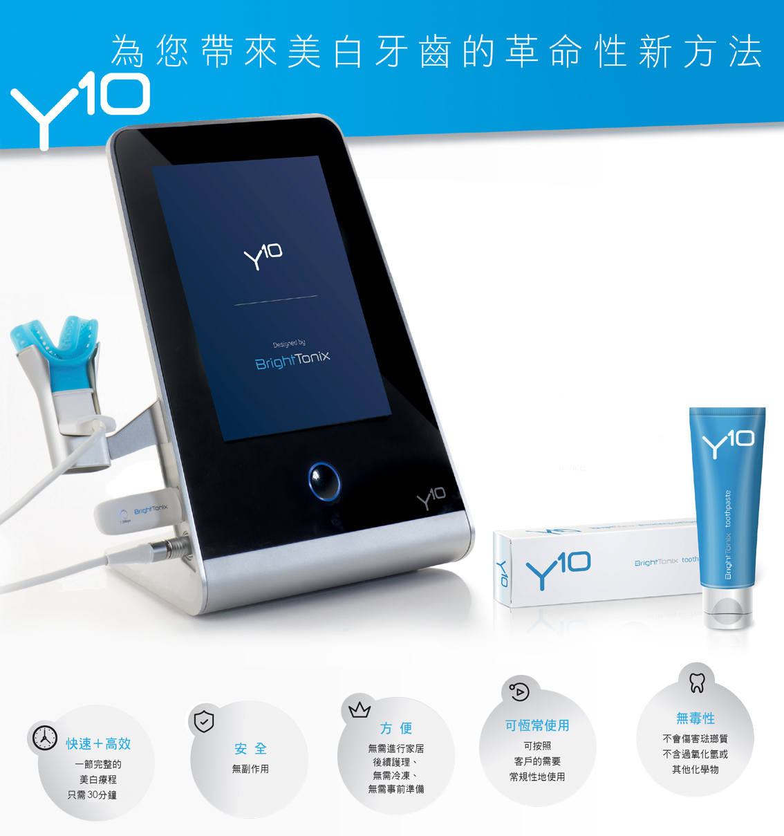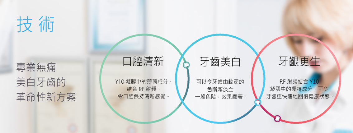 BrightTonix劃時代的創新研發-Y10。儀器發放低能量射頻(RF),去除琺瑯質上的頑固發色團,令您牙齒回復潔白。