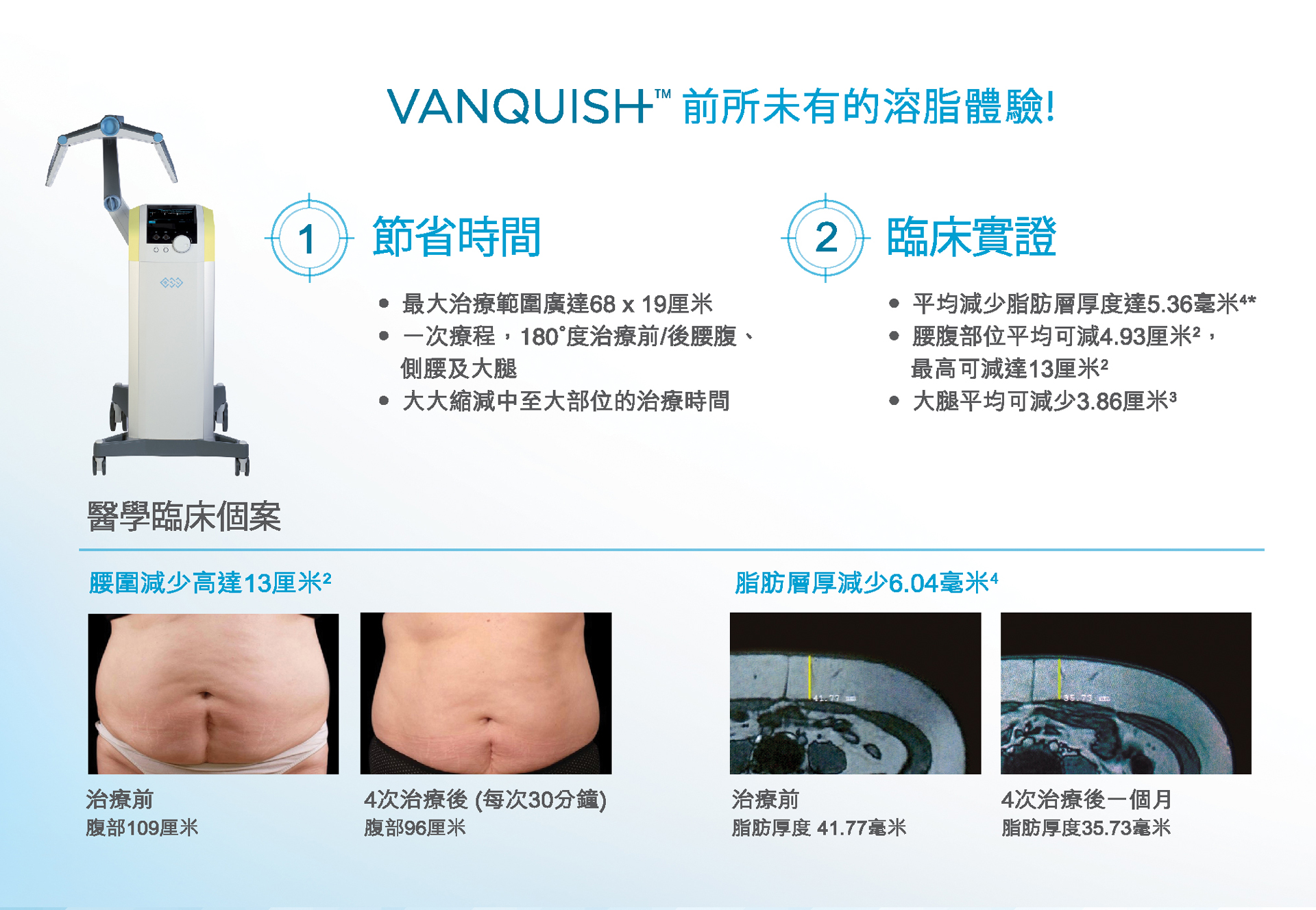 BTL VanquishTM獲美國FDA及歐盟CE雙重認可,共有14份的醫學報告,安全、有效、無痛、毋須觸碰、不用麻醉、無復元期是它的亮點。只須讓他們舒適地安坐或躺著休息,透過覆蓋範圍180o廣達 68cm X 19cm。臨床報告測試顯示,最高減幅可達13cm,成效絕對令人感到驚訝!