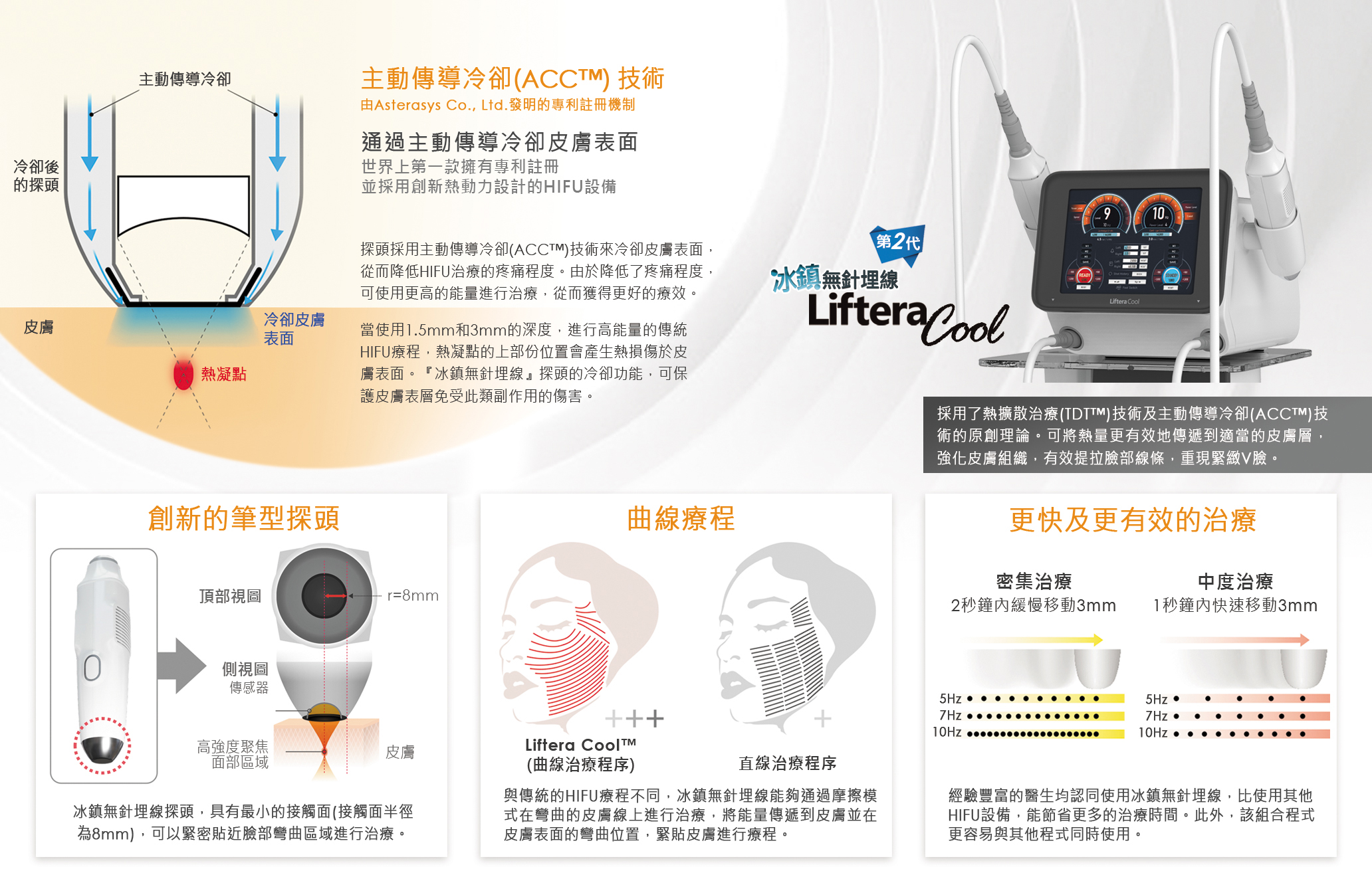 採用了熱擴散治療 (TDT TM) 技術,及主動傳導冷卻 (ACC TM) 技術的原創理論。可將熱量更有效地傳遞到適當的皮膚層,