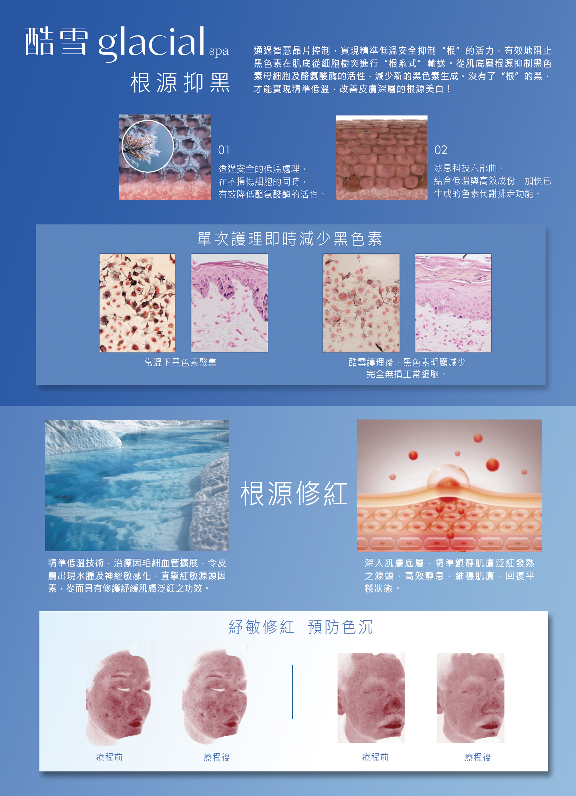 革新性冷凍美容科研成果:冰息科技,由美國哈佛大學與頂級的麻省總院醫療團隊攜手合作,凝聚八年創研成果、傾力打造。冰息科技專利通過精準低溫,深入肌底,從根源抑制黑色素母細胞及酪氨酸酶作用之活性,减少黑色素新生,同步改善皮膚深層的毛細血管水腫和神經敏化,直擊紅敏源頭因素,從而達致修護紓緩肌膚泛紅的功效。