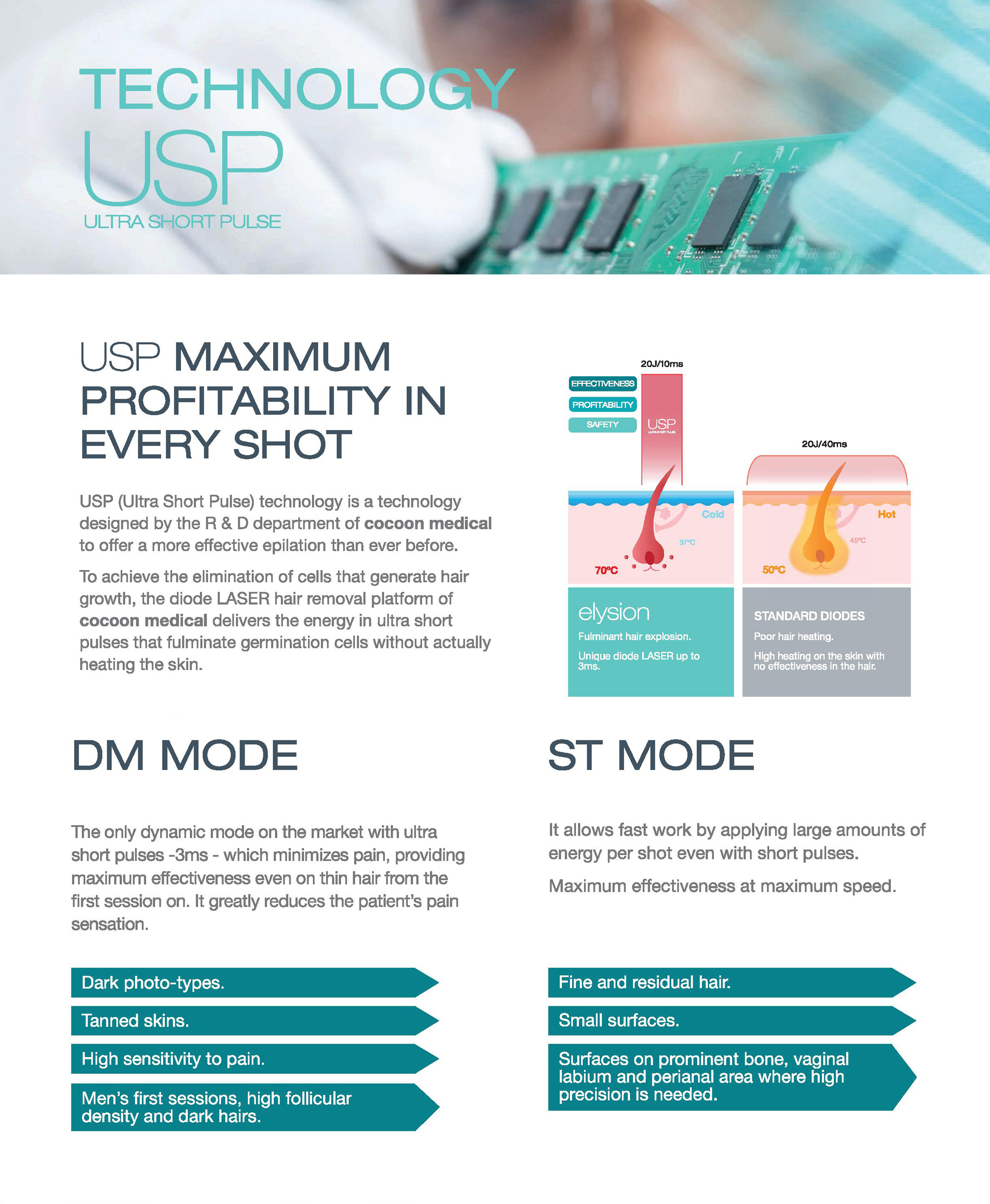 USP (Ultra Short Pulse) technology is a technology designed by the R & D department of cocoon medical to offer a more effective epilation than ever before.