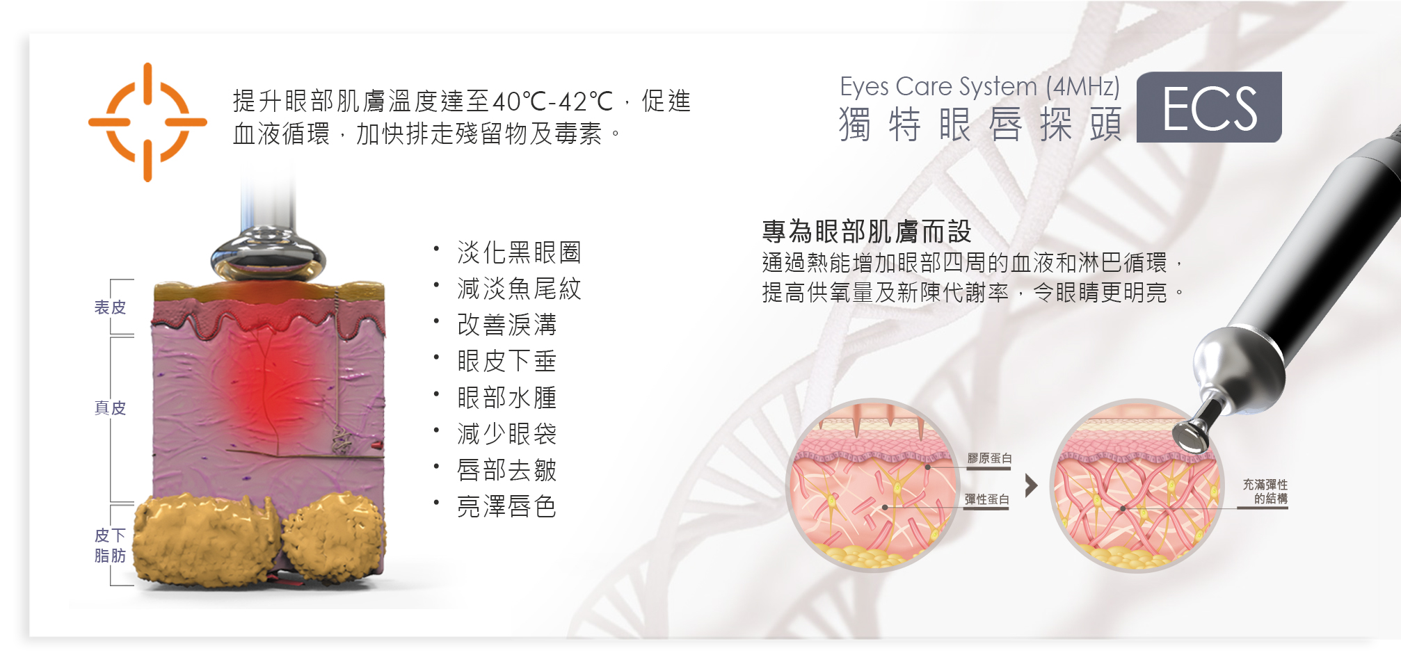 通過熱能增加眼部四周的血液和淋巴循環,提高供氧量及新陳代謝率,令眼睛更明亮。