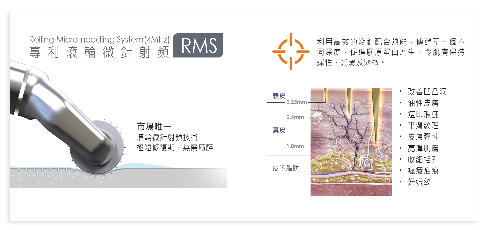 利用高效的滾針配合熱能,傳遞至三個不同深度,促進膠原蛋白增生,令肌膚保持彈性、光滑及緊緻。