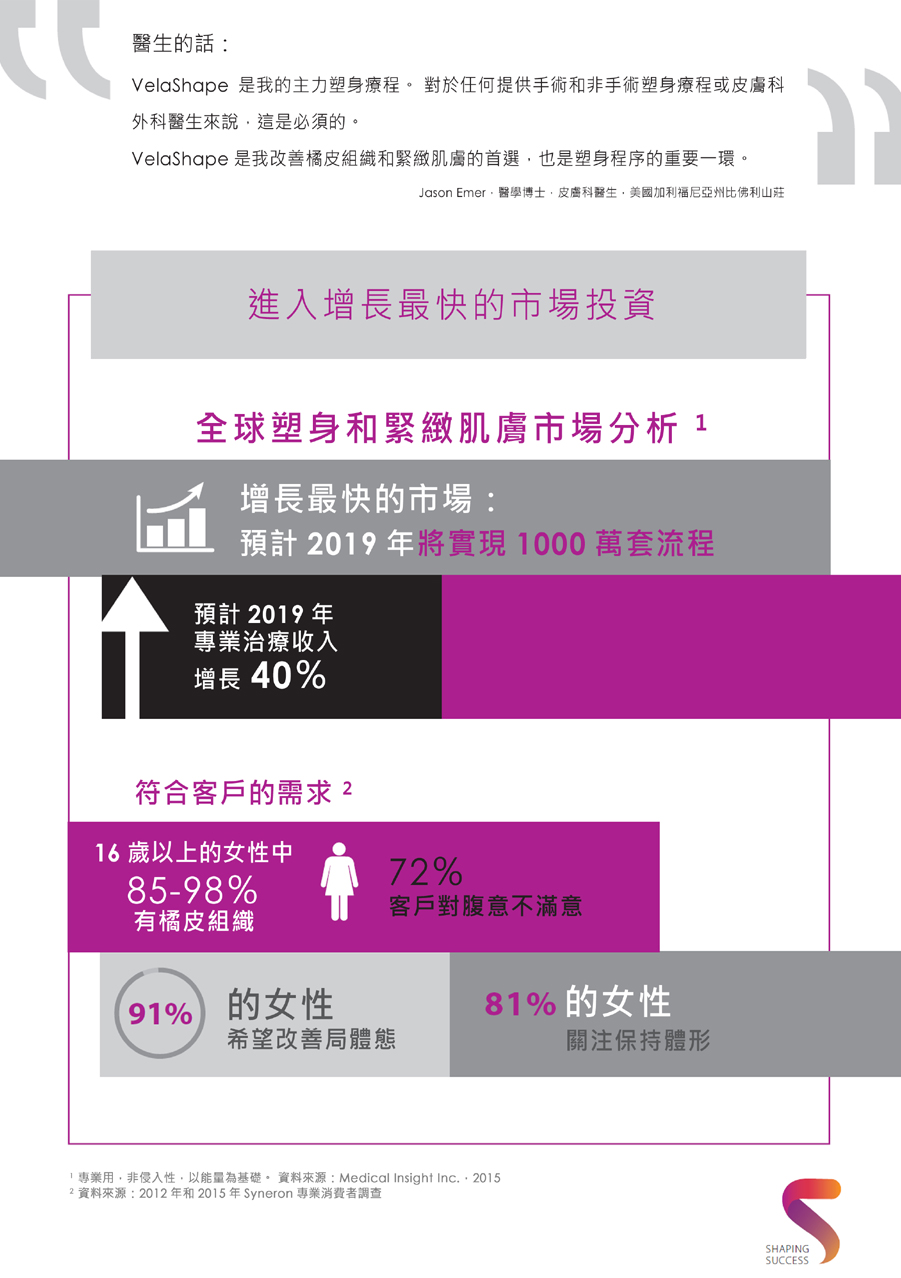 - 具有CE認證,適用於纖體塑形;獲FDA認證,可減少腹部和大腿的寸數,及幫助減少脂肪細胞體積。 VelaShape III 每年執行超過100萬個VelaShape治療,已經一次又一次地證明了其提供顯著,可測量和卓越的功效。