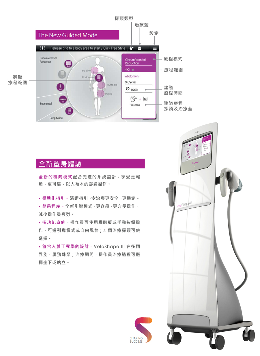 【VELASHAPE III 腰精】全新的導向模式配合先進的系統設計,享受更輕鬆,更可靠,以人為本的舒適操作。