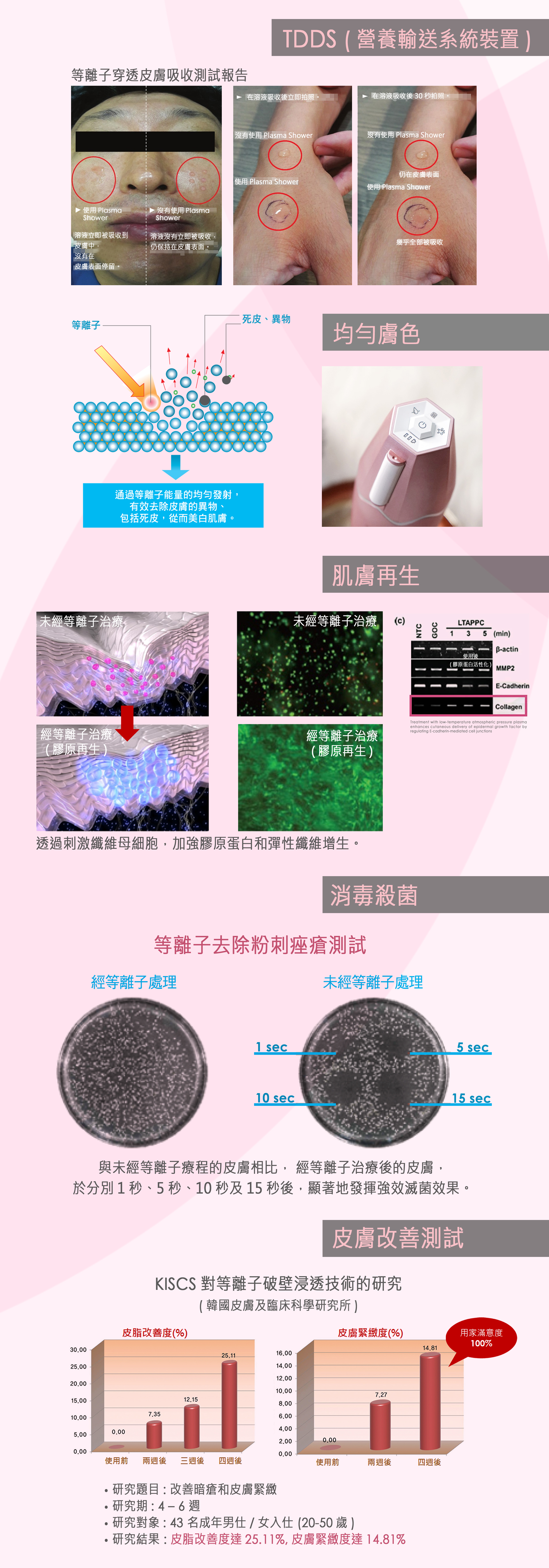 Plasma shower (超級等離子) 可去除細菌,幫助皮膚組織吸收護膚精華。低溫大氣離子能量,以強效的輸出,於皮膚表面作離子殺菌刺激作用,有效令肌膚再生。透過抗菌,TDDS 營養輸送系統裝置,能令皮膚美白及膠原再生。