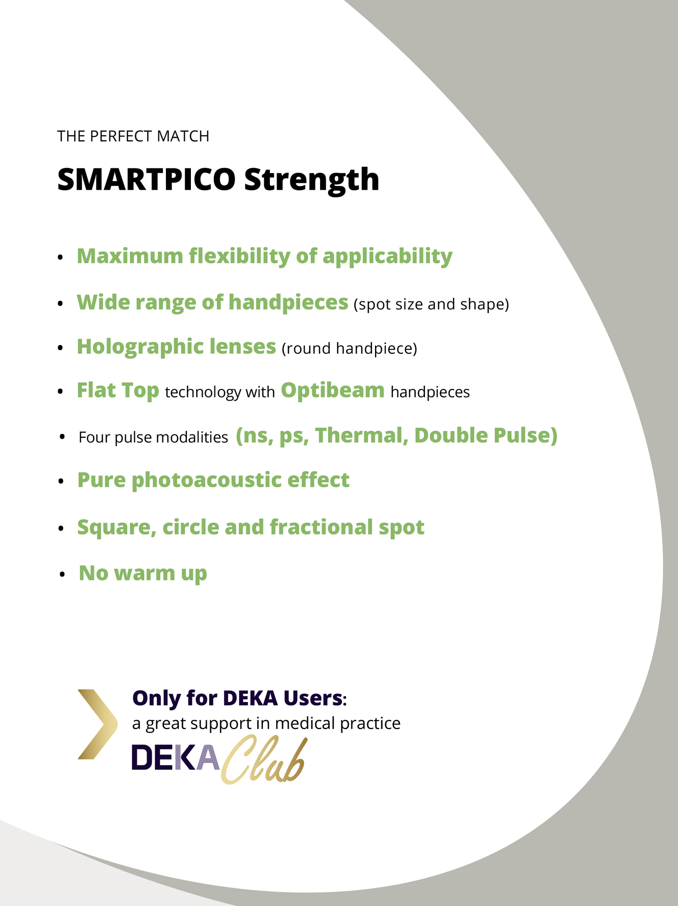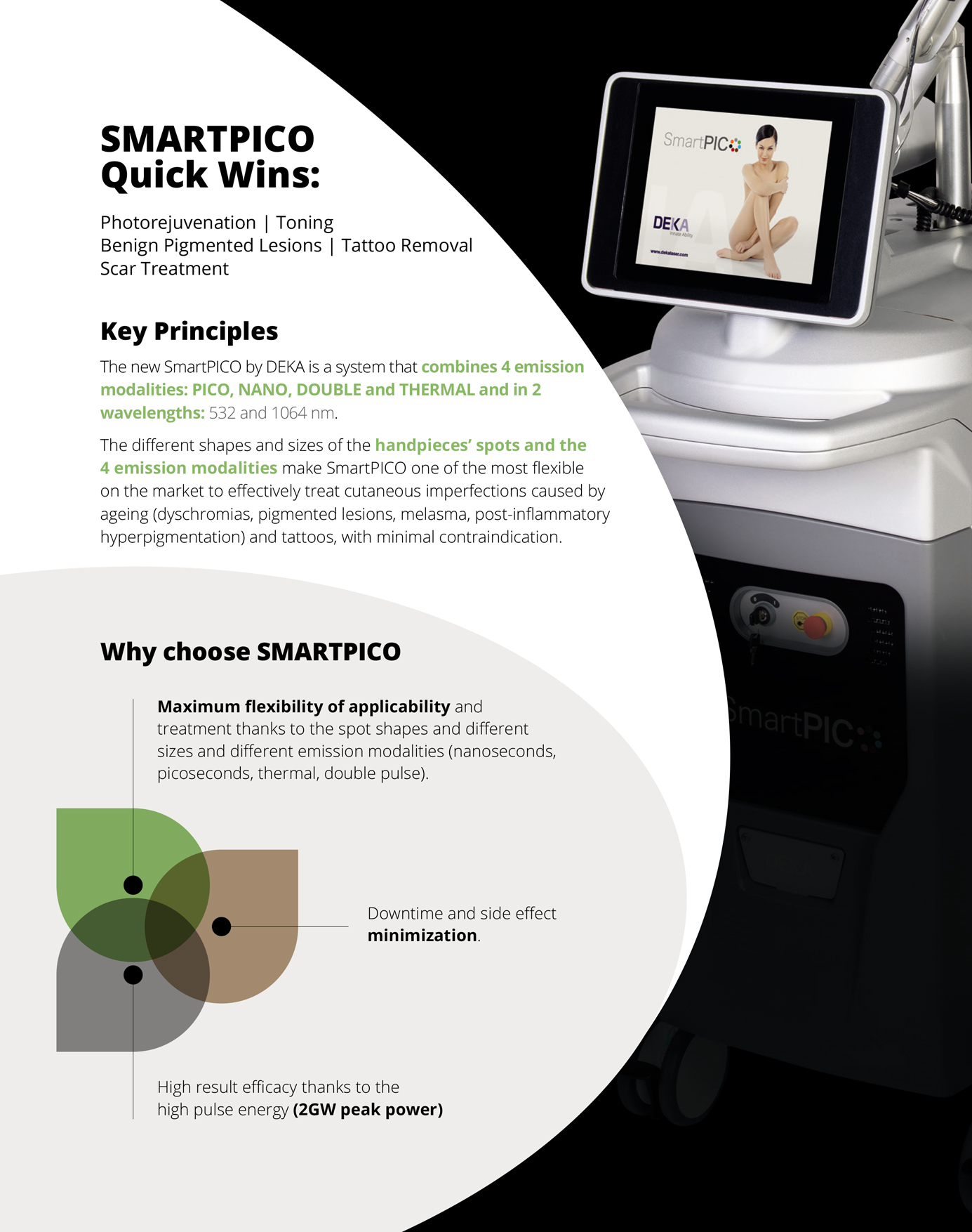 The new SmartPICO by DEKA is a system that combines 4 emission modalities: PICO, NANO, DOUBLE and THERMAL and in 2 wavelengths: 532 and 1064 nm.