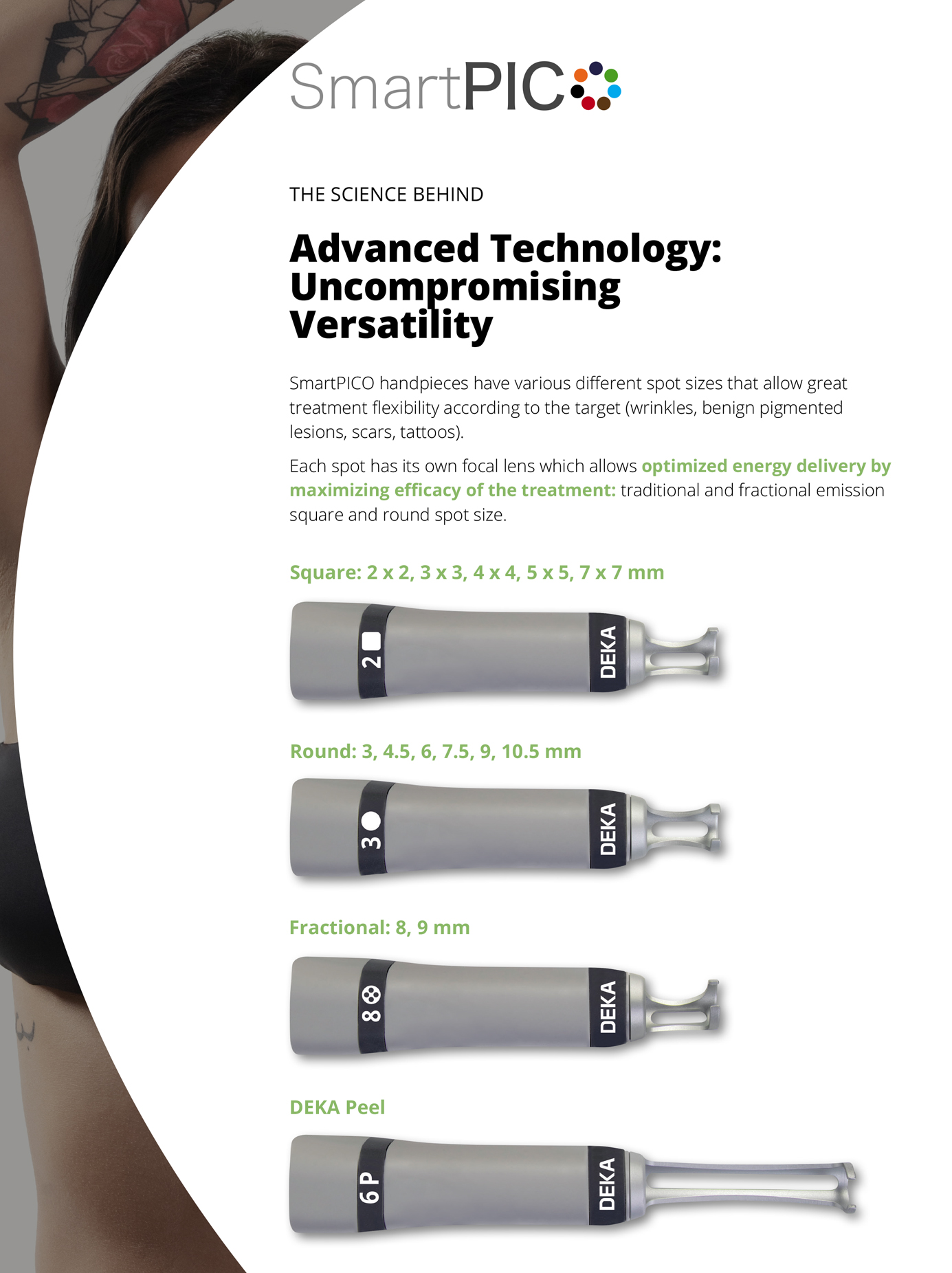 SmartPICO handpieces have various different spot sizes that allow great treatment flexibility according to the target (wrinkles, benign pigmented lesions, scars, tattoos).