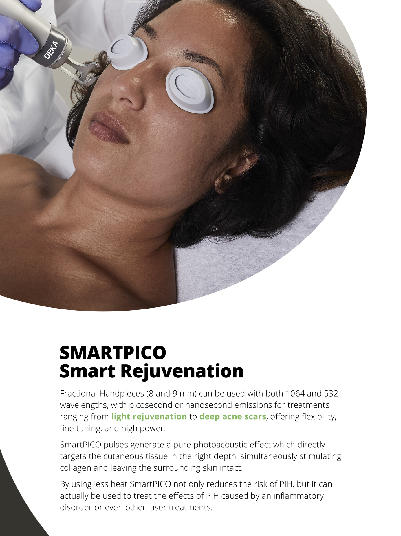 Fractional Handpieces (8 and 9 mm) can be used with both 1064 and 532 wavelengths, with picosecond or nanosecond emissions for treatments ranging from light rejuvenation to deep acne scars, offering flexibility, fine tuning, and high power. SmartPICO pulses generate a pure photoacoustic effect which directly targets the cutaneous tissue in the right depth, simultaneously stimulating collagen and leaving the surrounding skin intact. By using less heat SmartPICO not only reduces the risk of PIH, but it can actually be used to treat the effects of PIH caused by an inflammatory disorder or even other laser treatments.