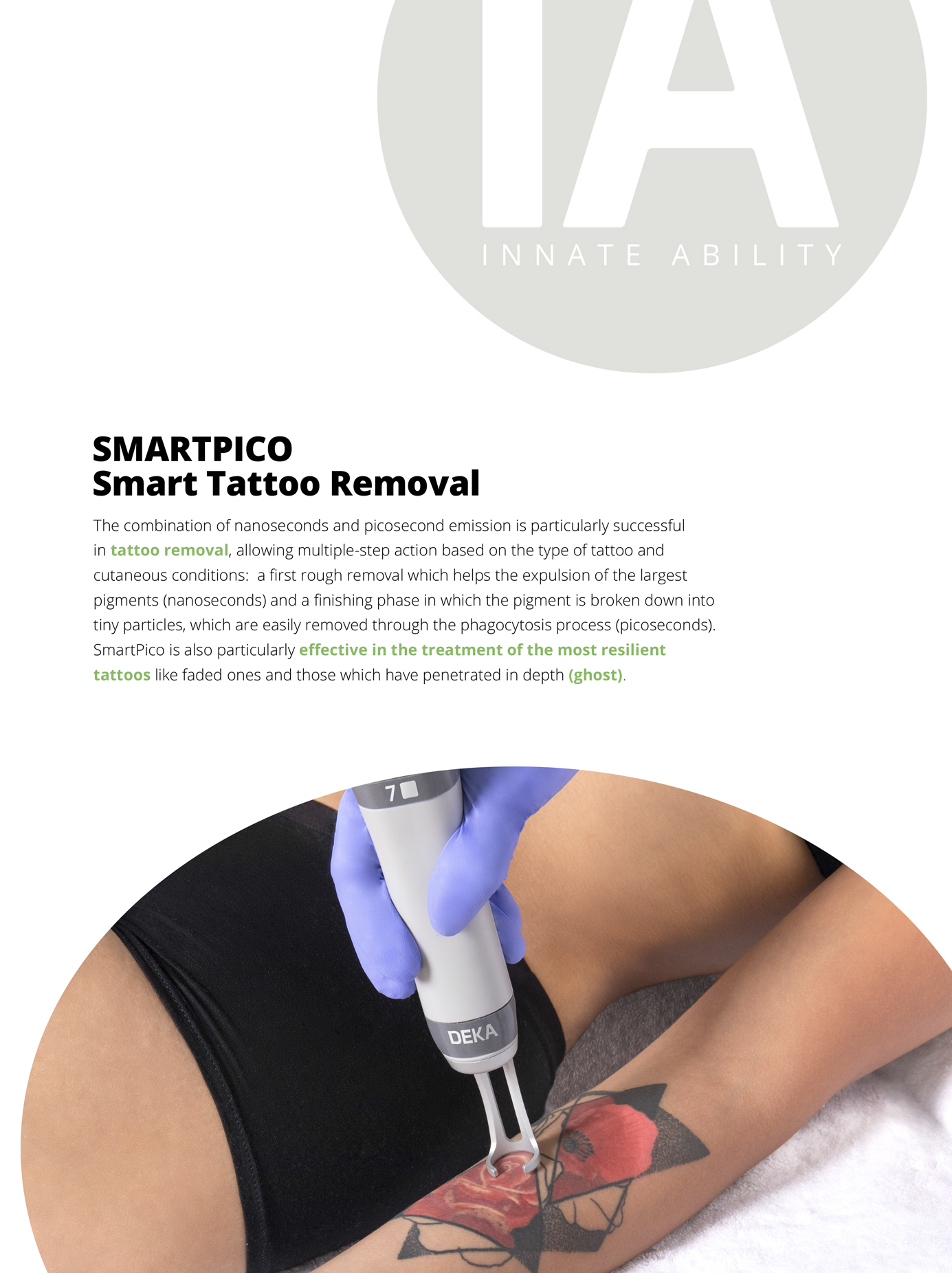 The combination of nanoseconds and picosecond emission is particularly successful in tattoo removal, allowing multiple-step action based on the type of tattoo and cutaneous conditions: a first rough removal which helps the expulsion of the largest pigments (nanoseconds) and a finishing phase in which the pigment is broken down into tiny particles, which are easily removed through the phagocytosis process (picoseconds). SmartPico is also particularly effective in the treatment of the most resilient tattoos like faded ones and those which have penetrated in depth (ghost).