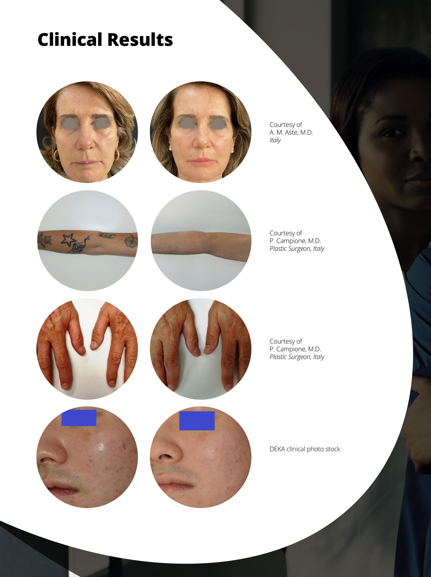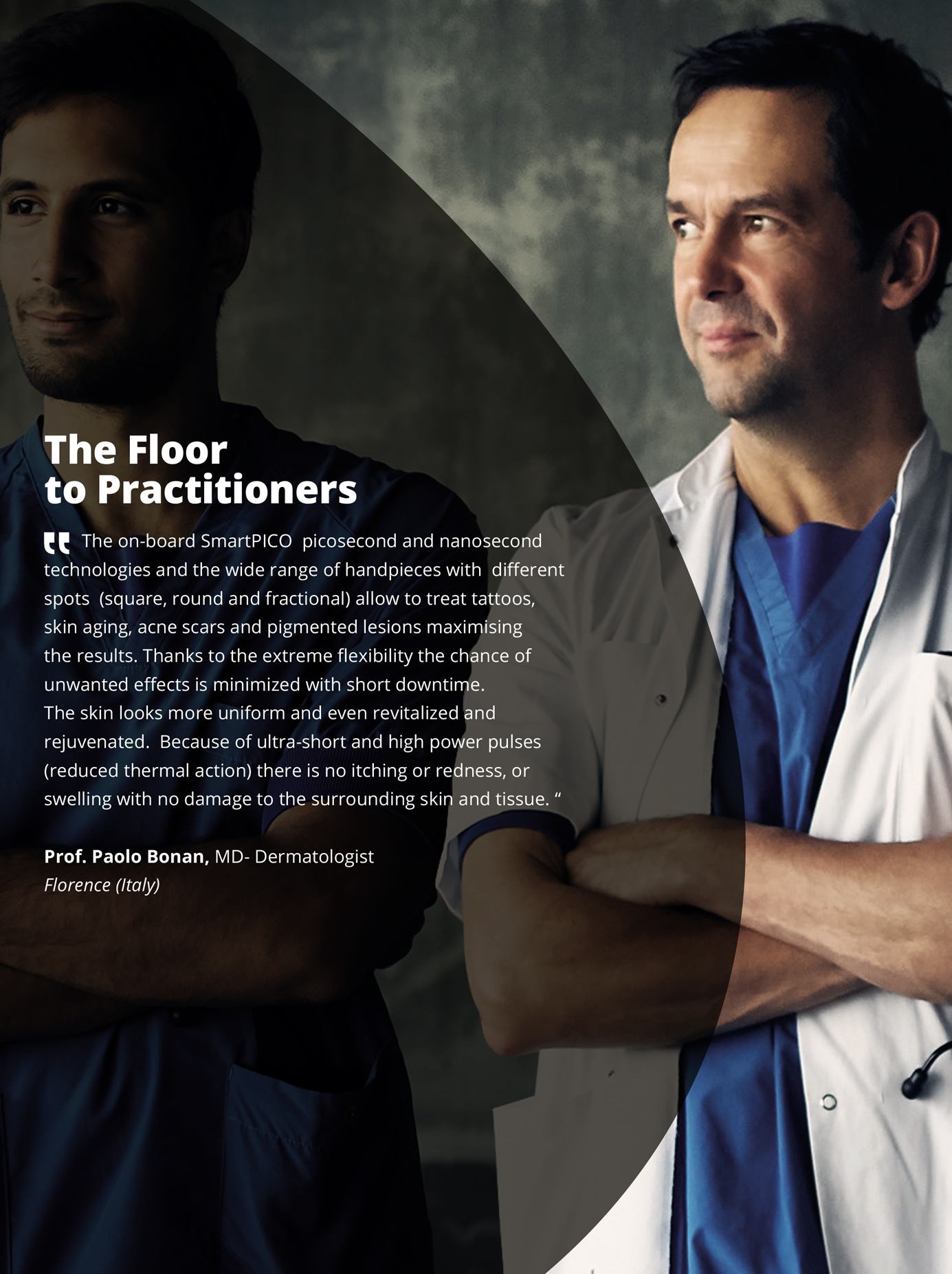 The on-board SmartPICO picosecond and nanosecond technologies and the wide range of handpieces with different spots (square, round and fractional) allow to treat tattoos, skin aging, acne scars and pigmented lesions maximising the results. Thanks to the extreme flexibility the chance of unwanted effects is minimized with short downtime. The skin looks more uniform and even revitalized and rejuvenated. Because of ultra-short and high power pulses (reduced thermal action) there is no itching or redness, or swelling with no damage to the surrounding skin and tissue. “