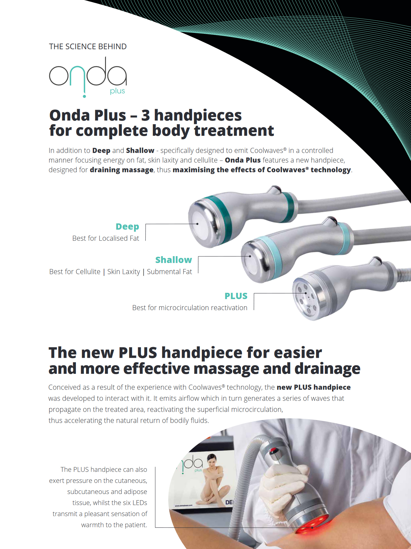 skin laxity and cellulite – Onda Plus features a new handpiece, designed for draining massage, thus maximising the effects of Coolwaves® technology.