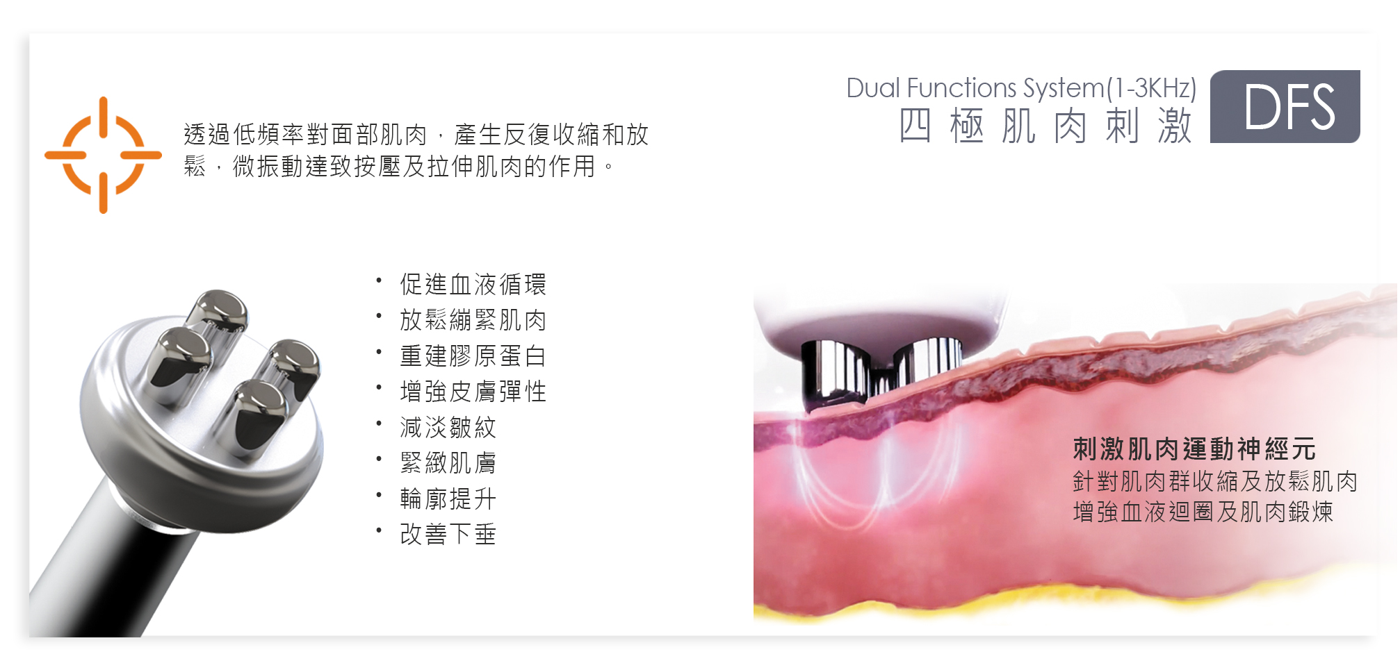 透過低頻率對面部肌肉,產生反復收缩和放鬆,微振動達致按壓及拉伸肌肉的作用。