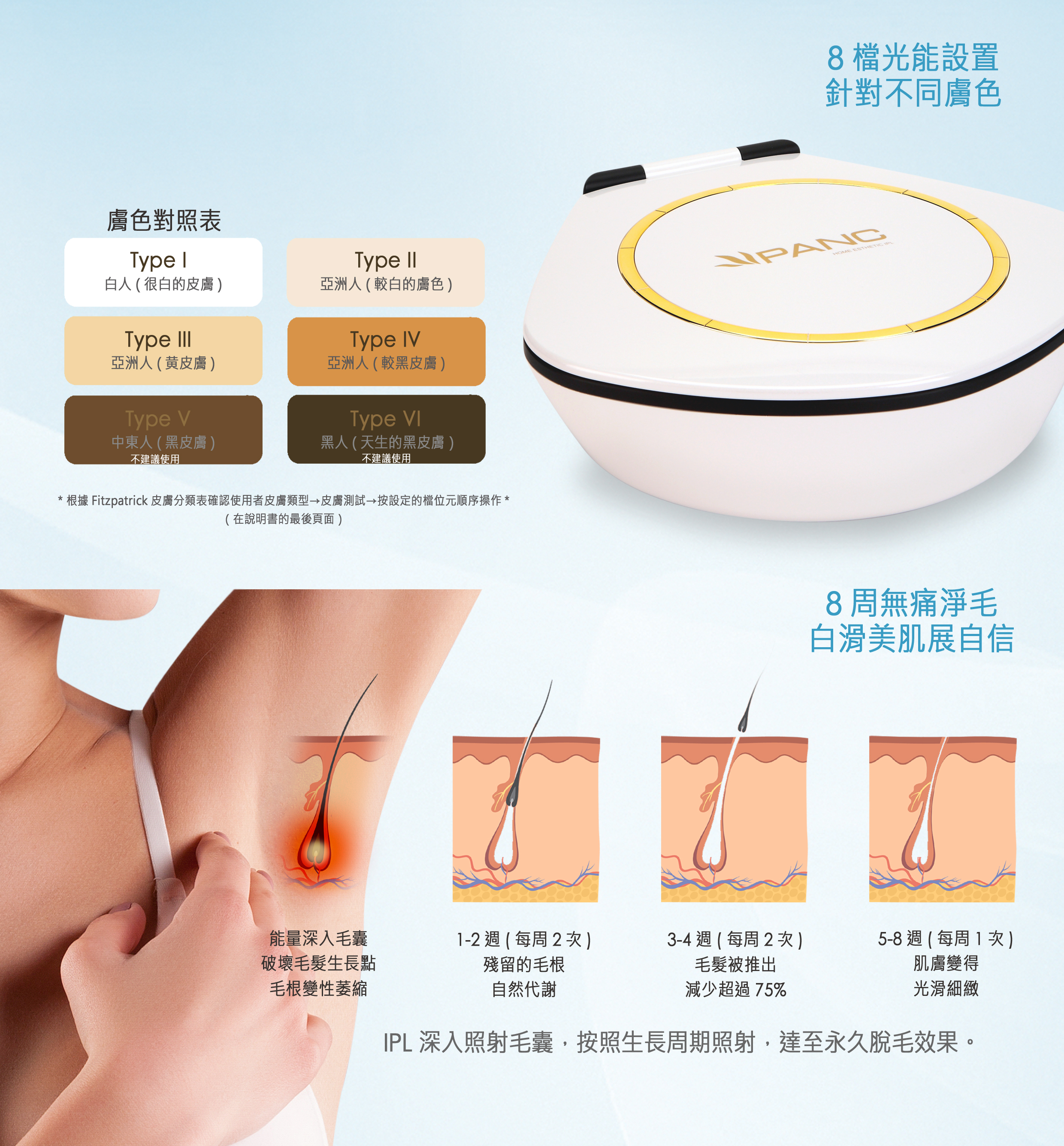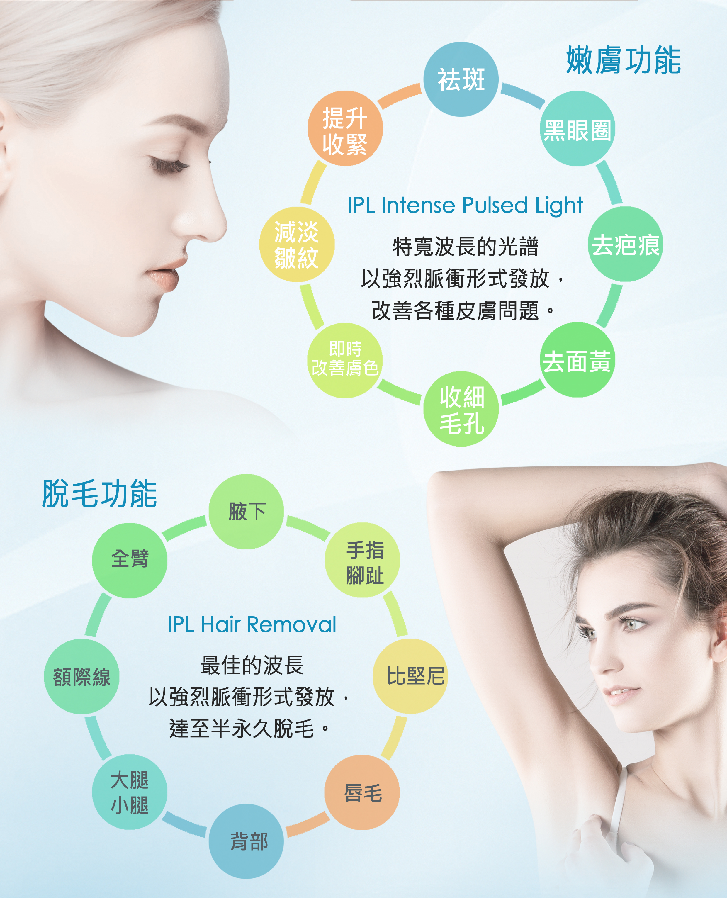 脫毛、袪斑、美白、收細毛孔及增加彈性
