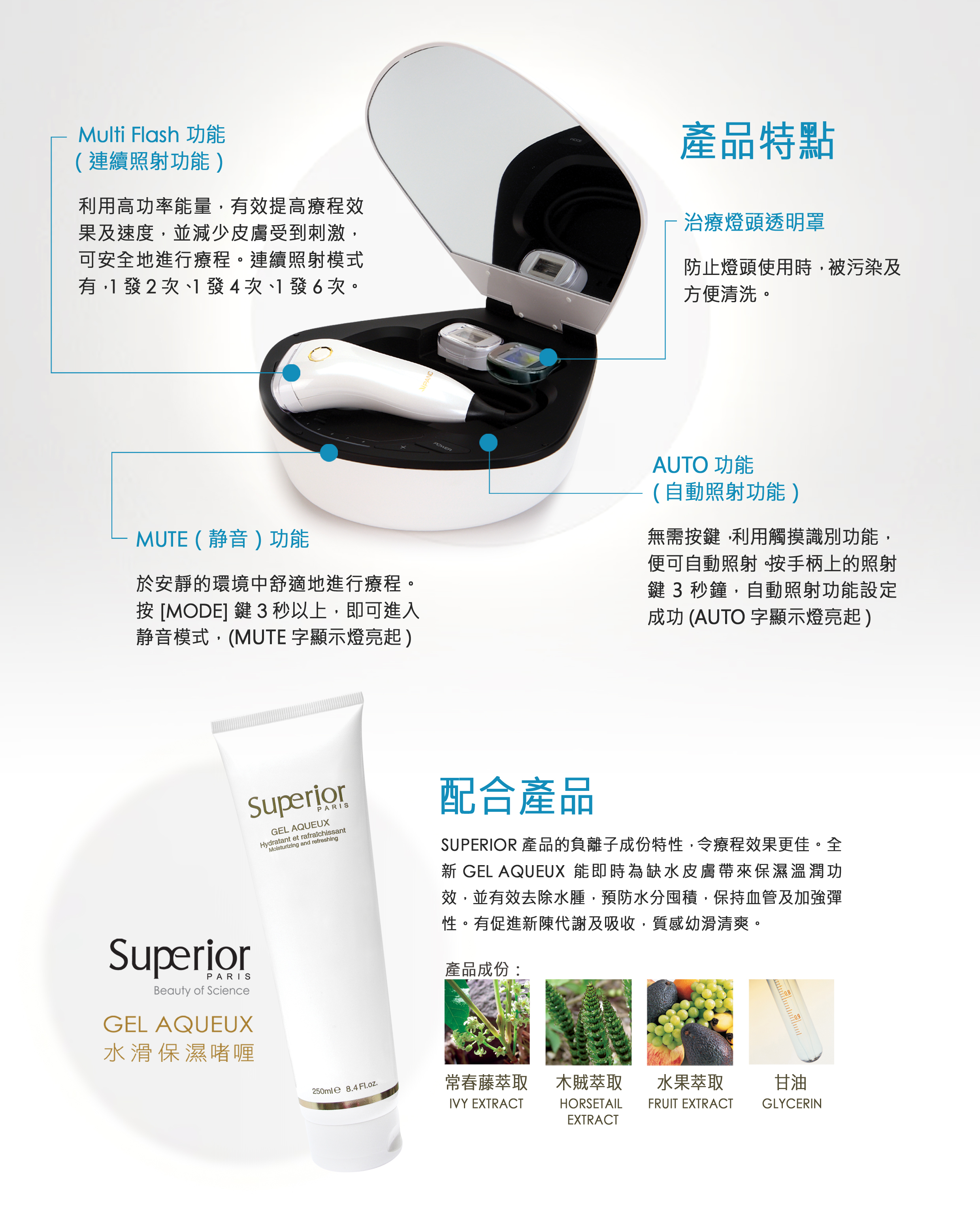 SUPERIOR產品的負離子成份特性,令療程效果更佳。全新 GEL AQUEUX能即時為缺水皮膚帶來保濕溫潤功效,並有效去除水腫,預防水分囤積,保持血管及加強彈性。有促進新陳代謝及吸收,質感幼滑清爽。