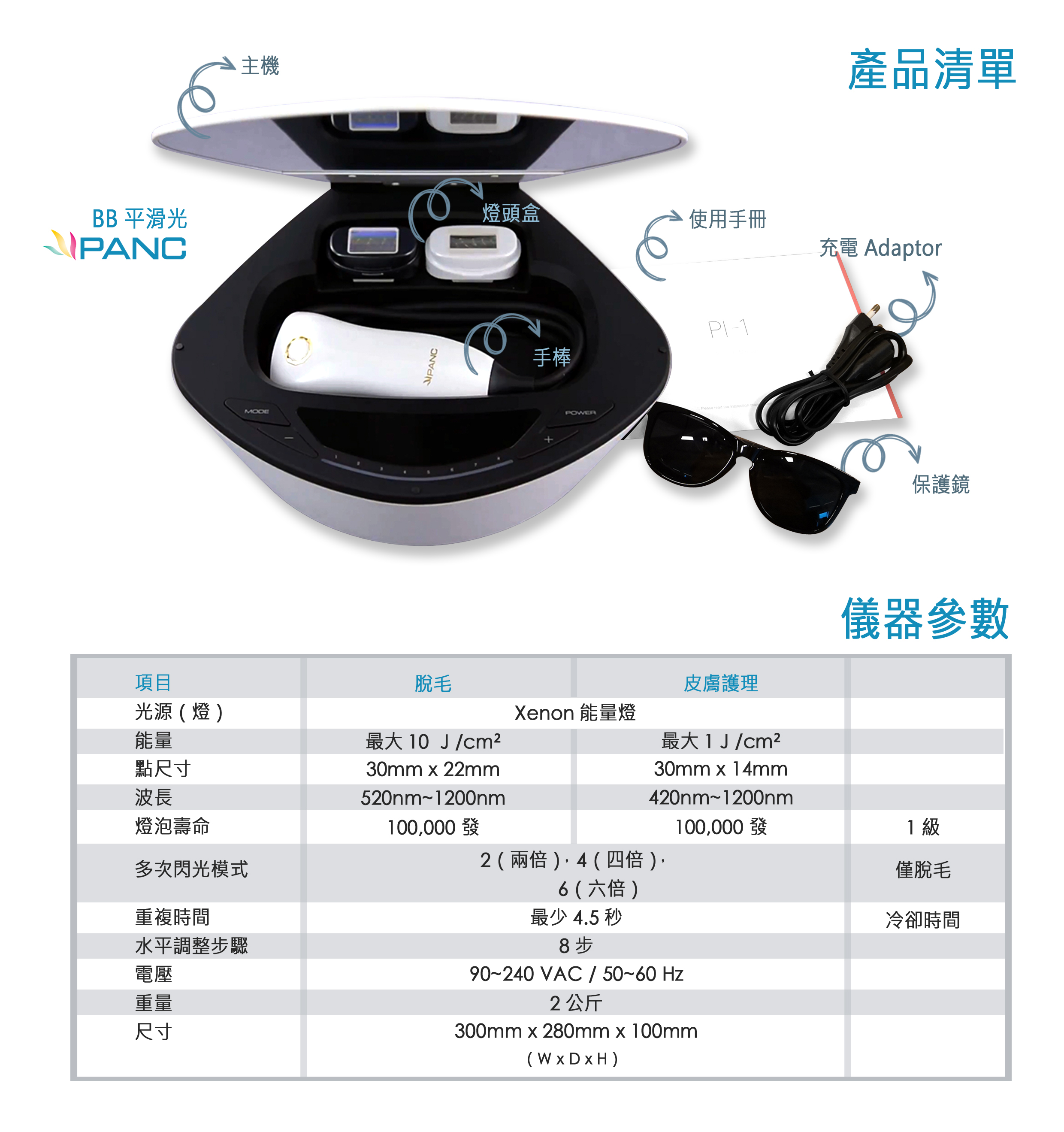 配備 脫毛燈頭、嫩膚燈頭