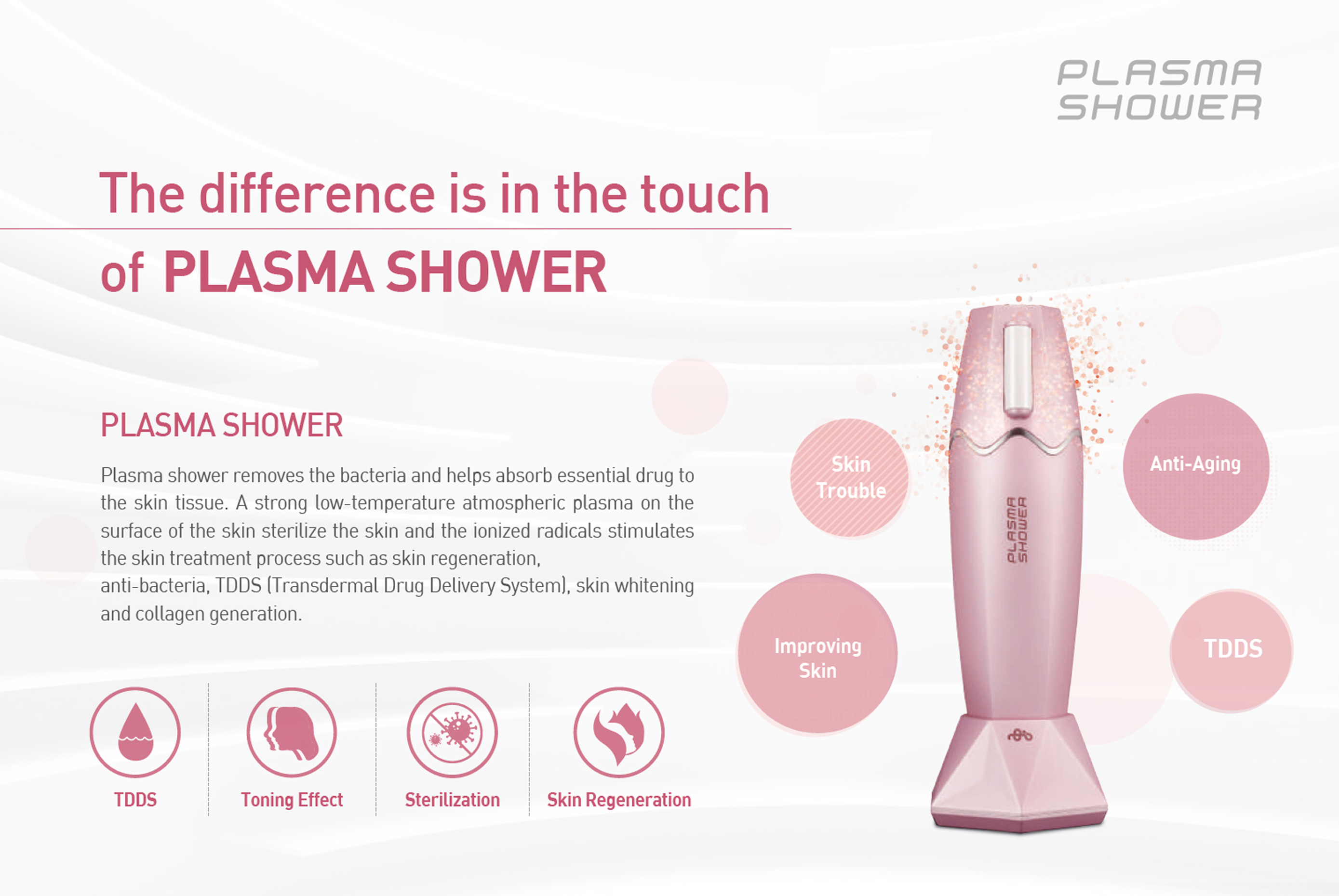 Plasma shower removes the bacteria and helps absorb essential drug to the skin tissue. A strong low-temperature atmospheric plasma on the surface of the skin sterilize the skin and the ionized radicals stimulates the skin treatment process such as skin regeneration, anti-bacteria, TDDS (Transdermal Drug Delivery System), skin whitening and collagen generation.