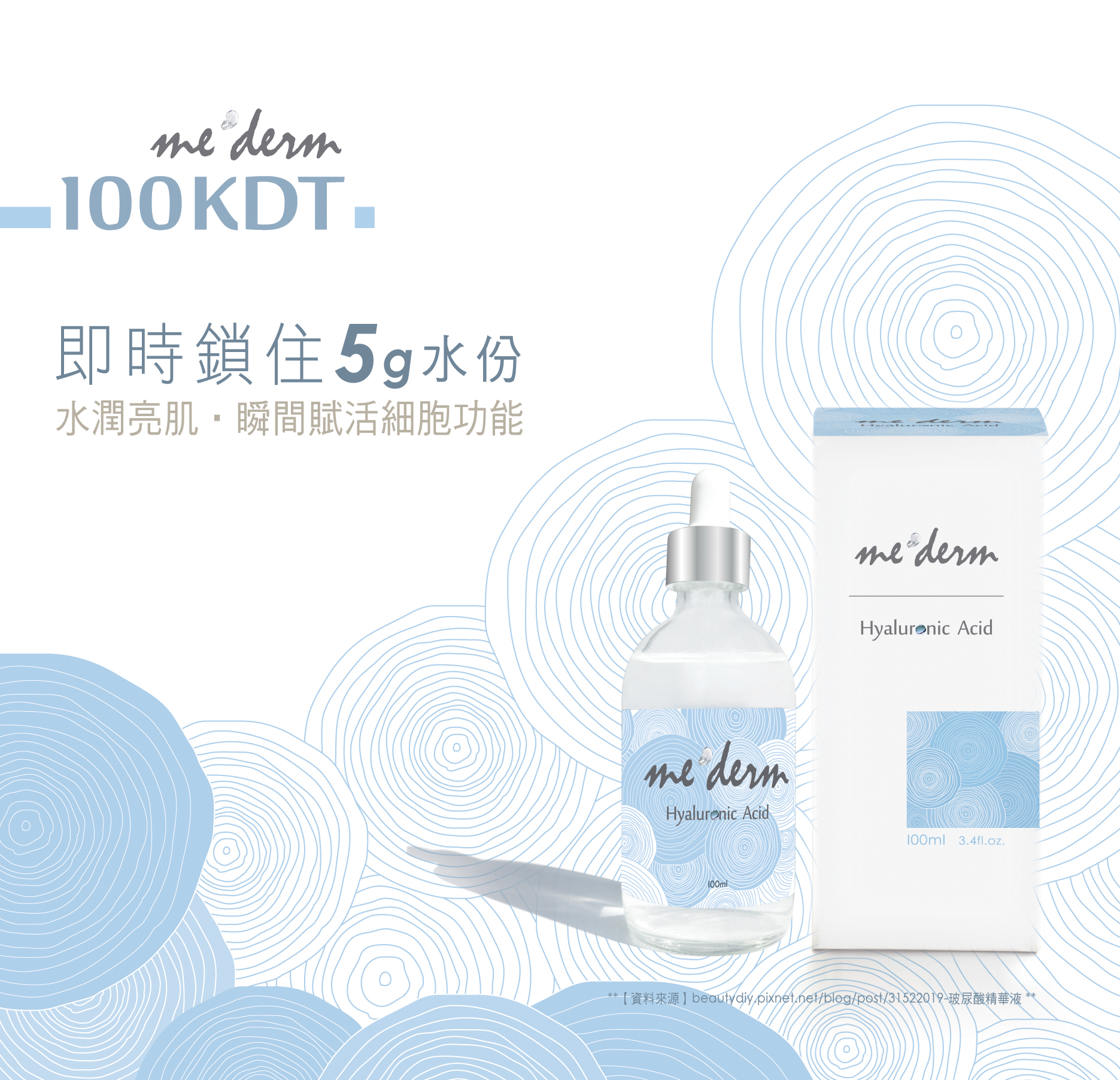 一般玻尿酸的份子量以界於100,000 ─ 300,000 DT之間的保濕性及親膚性效果為最好。假若玻尿酸的份子量超過這數量,它會因結構鬆散或份子過大,而影響其吸收能力。因此,100KDT採用了100,000DT的最佳份子值,只需數滴100KDT,便能發揮其1,000倍的超強鎖水功效。