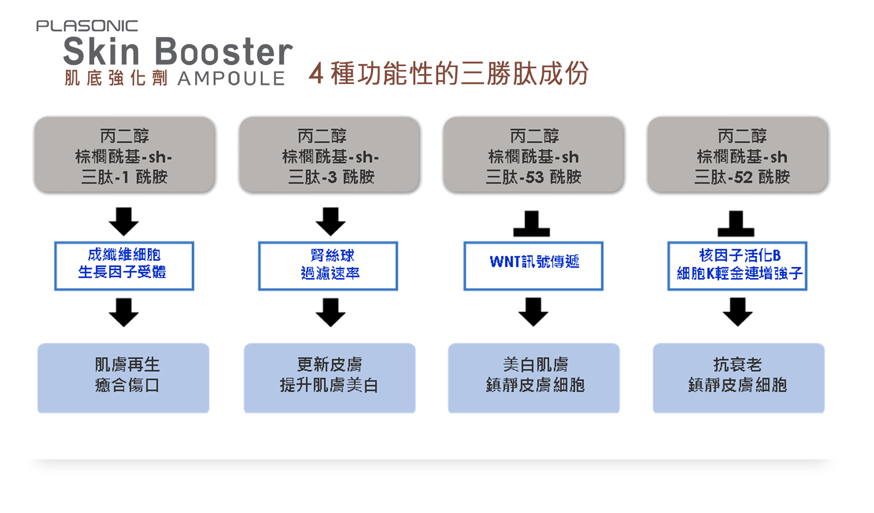 4種三勝肽成份透過不同功能機制,改善各種肌膚問題。